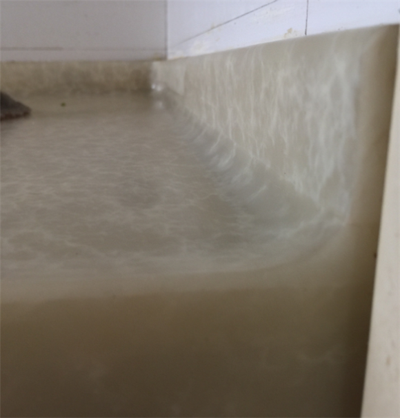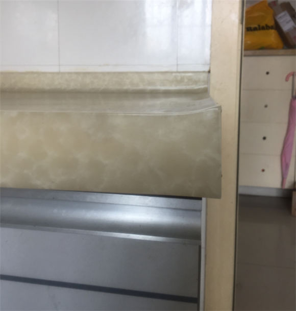 第二種方式是在擋水和臺(tái)面間做了圓弧過渡面的,這種方式是需要在廠里就把擋水和臺(tái)面組合在一起,所以對(duì)現(xiàn)場(chǎng)量尺下單加工安裝的要求都比較高,而且由于墻面磚的不平整使得擋水和墻之間的縫隙會(huì)有明顯的差異,導(dǎo)致后期做了美縫也不是很美觀。所以現(xiàn)在的擋水條用第一種方式的比較多。