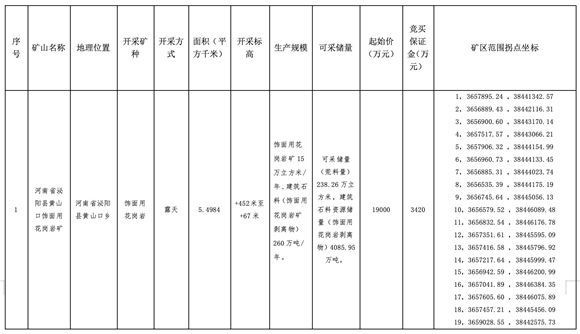 為促進我市礦產資源勘查開發(fā)和增儲上產,經駐馬店市人民政府批準,受駐馬店市自然資源和規(guī)劃局委托,按照《自然資源部關于印發(fā)的通知》(自然資規(guī)〔2023〕1號)、《河南省自然資源廳關于印發(fā)的通知》(豫自然資規(guī)〔2023〕1號)相關規(guī)定,現就“河南省泌陽縣黃山口飾面用花崗巖礦”采礦權網上拍賣出讓事宜公告如下: