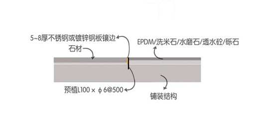 ▼不同顏色的透水混凝土之間用不銹鋼鑲邊以保證線條的流暢度。